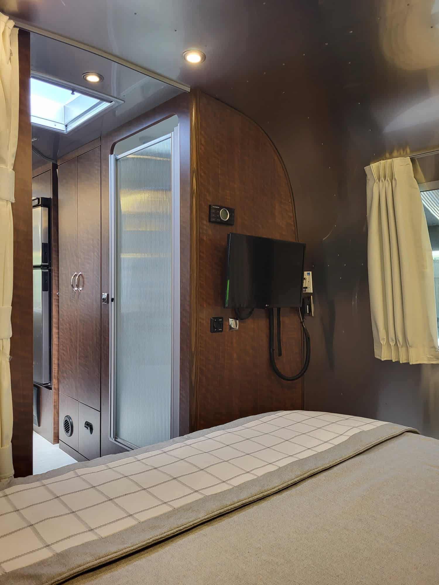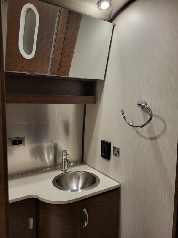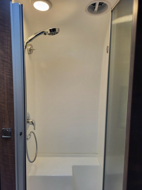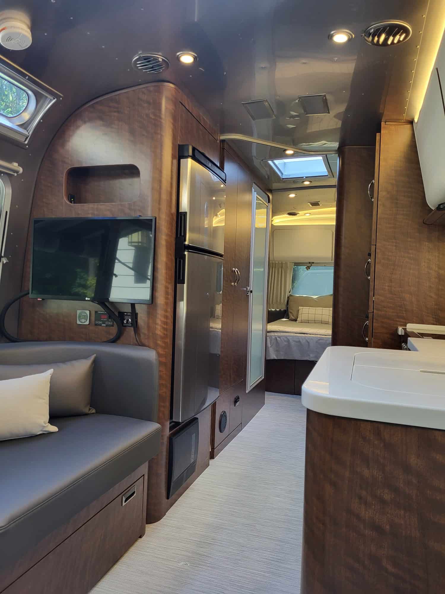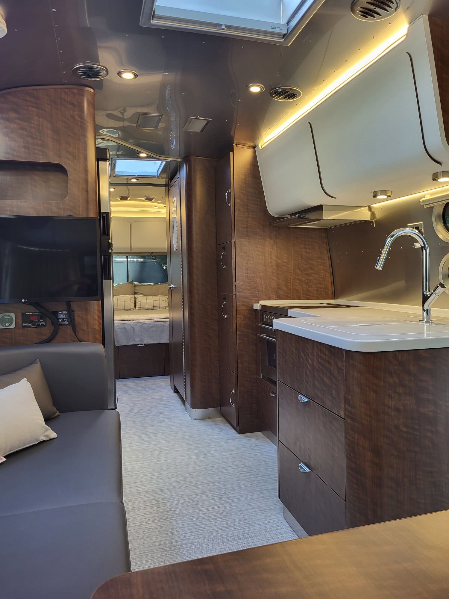 There is ample storage inside and out. Very comfortable, stylish and has room for kids and/or pets with multiple sleeping areas and 2 LG screens including many USB ports.