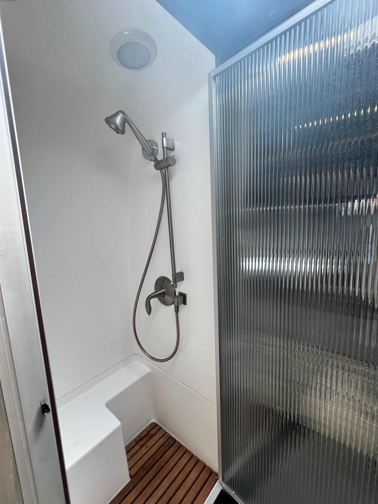 The spacious bathroom features a full shower with aftermarket teak floor, towel warmer, and a water-saving on/off valve. All cabinetry, flooring, and upholstery are original and in excellent condition.