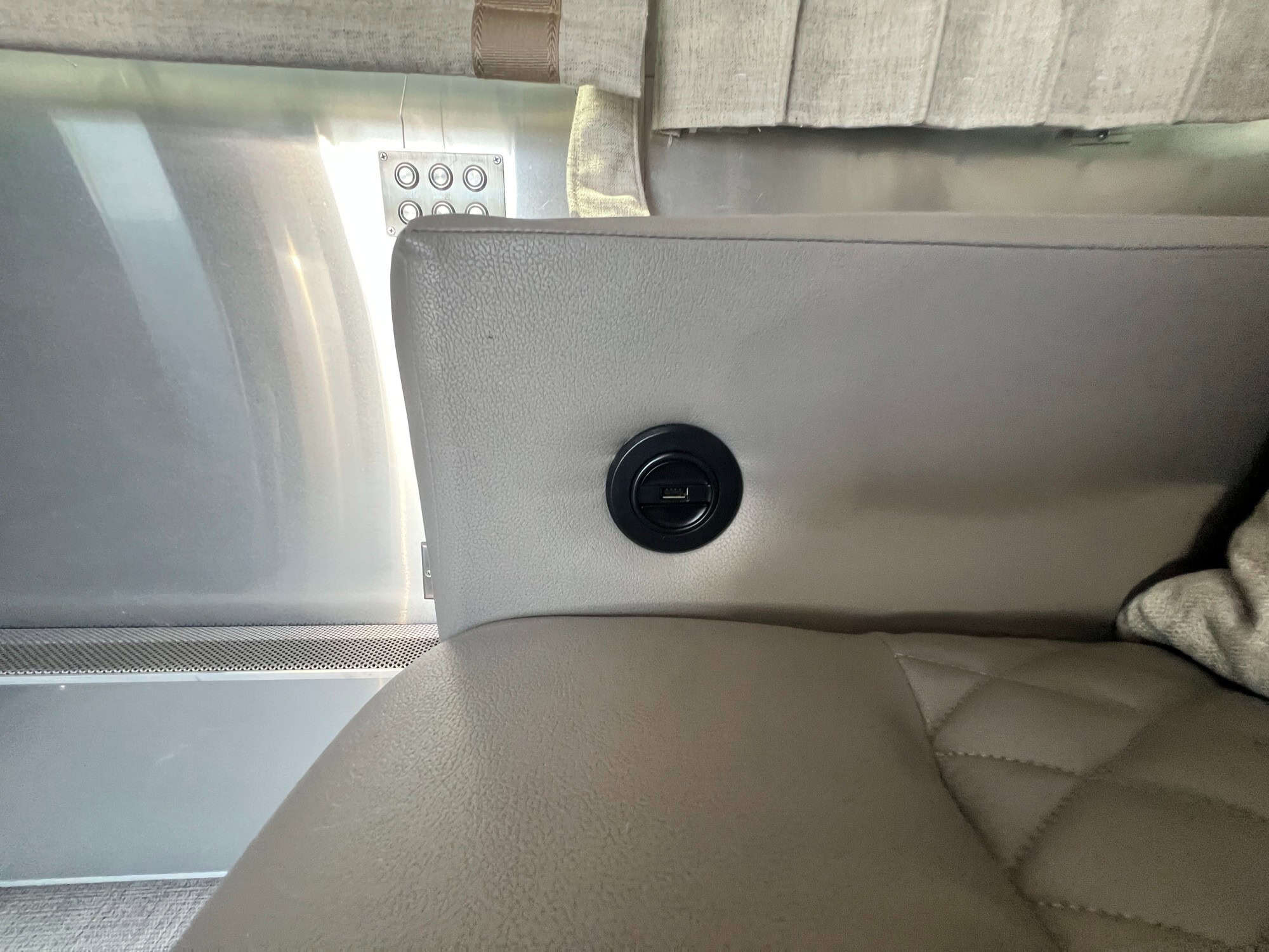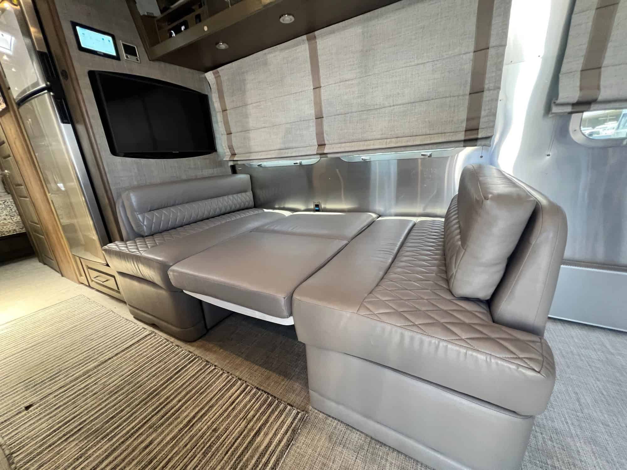 Inside, you’ll find Airstream’s Estate Brown cabinetry paired with Earl Grey UltraLeather® seating for a warm, modern aesthetic. The rear RV queen bed is powered and adjustable, offering a restful night’s sleep with an upgraded Classic mattress. The powered dinette table can convert into a second bunk with included cushions.