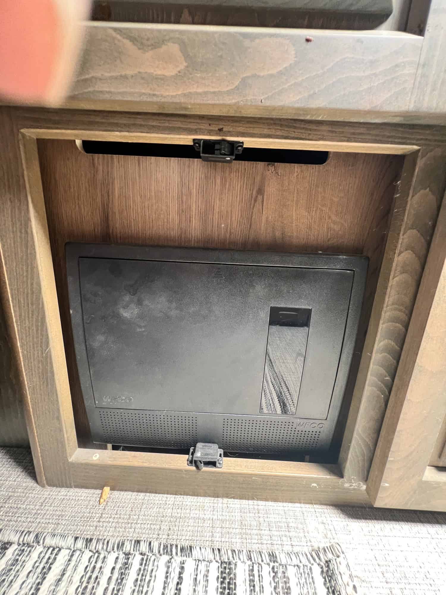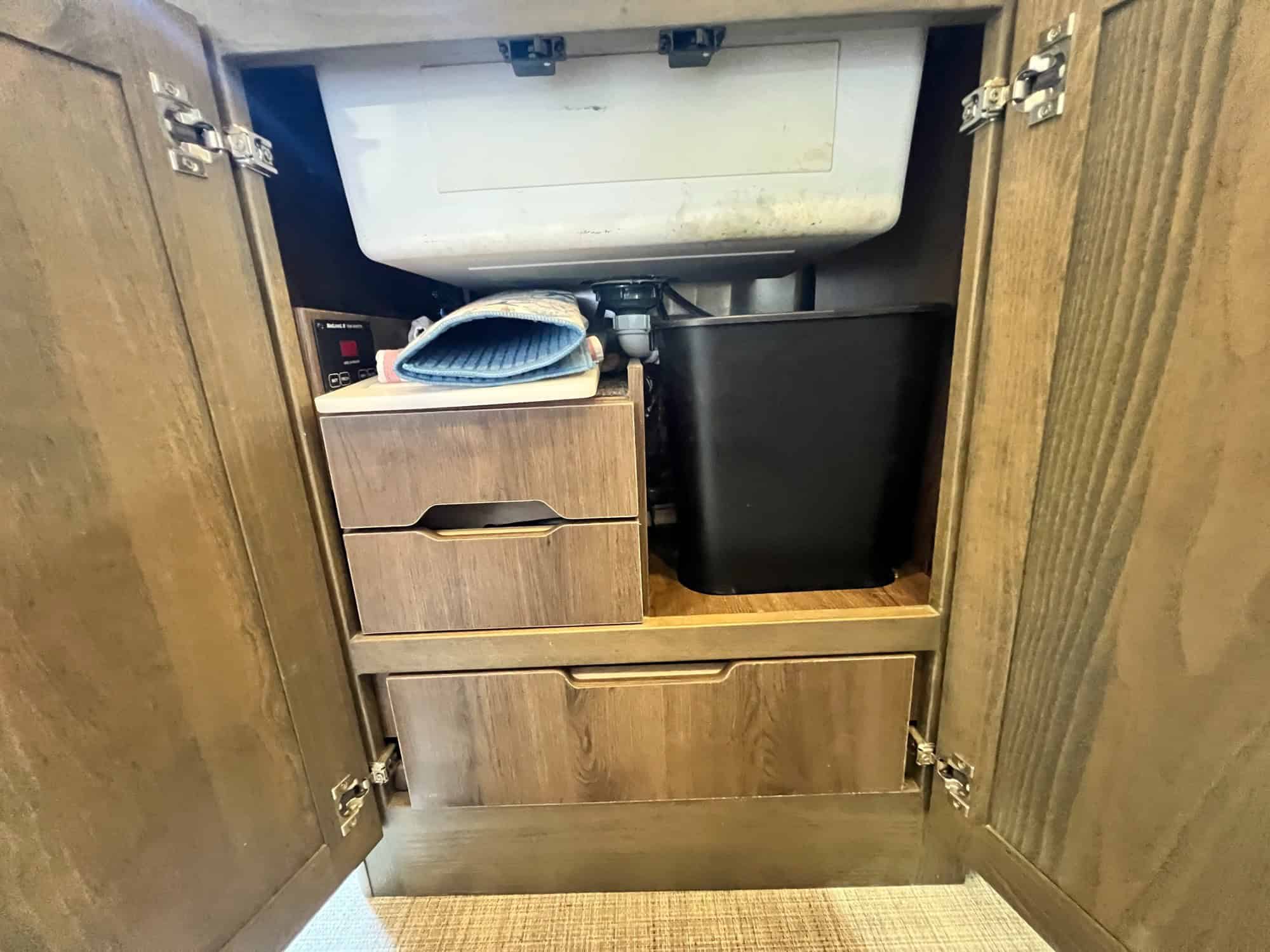This Airstream includes the renowned Alde hydronic heating system, offering radiant floor and cabin heat as well as instant hot water. The all-electric galley features a 3-burner cooktop, convection microwave/air fryer, and a 12V Dometic refrigerator (8.2 cu ft) with freezer.