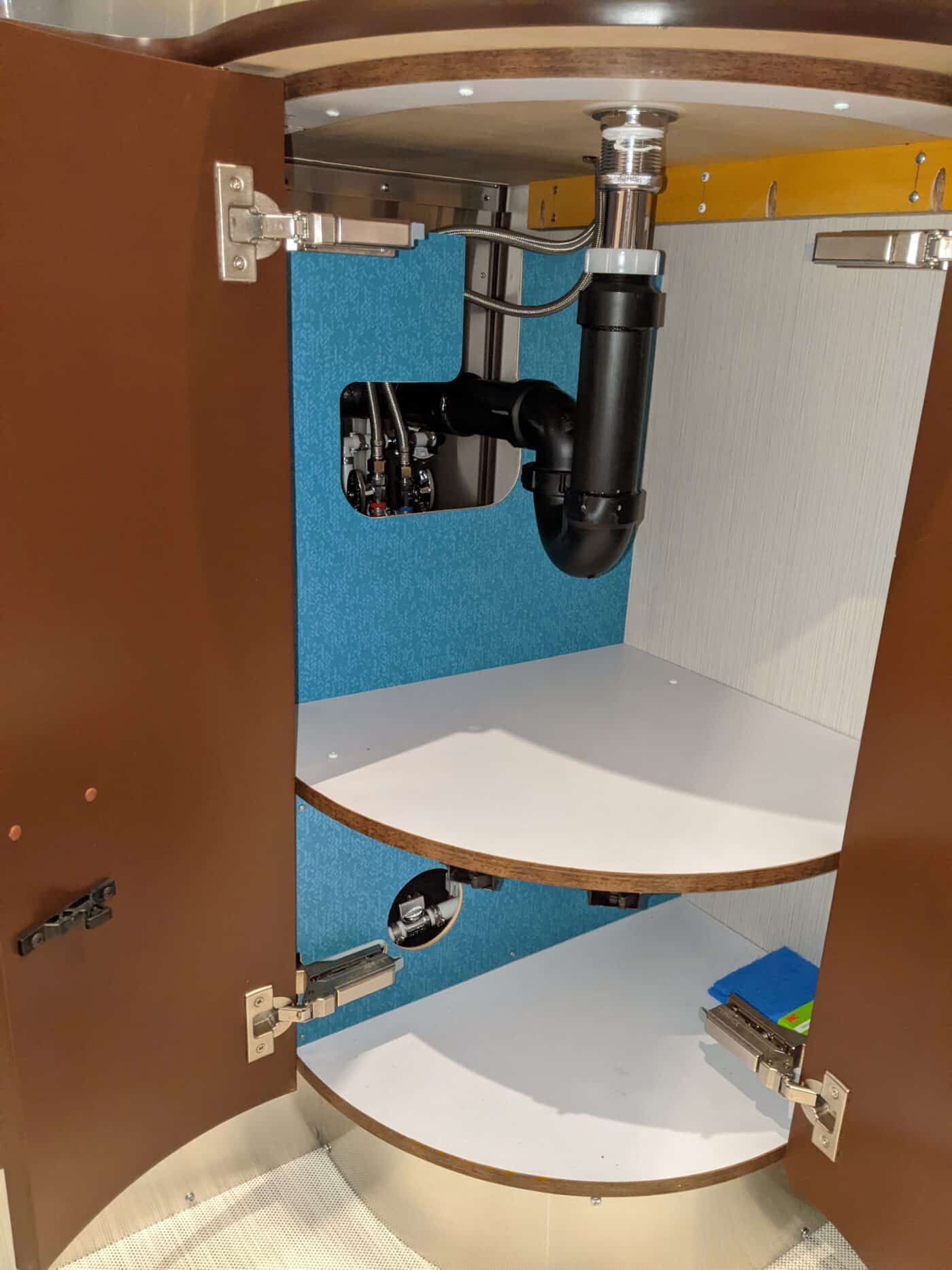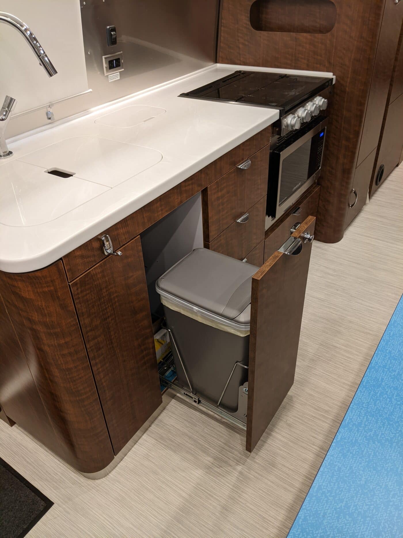19. The kitchen base cabinet has been redesigned to accommodate the addition of a 35 quart waste bin with lid and mounted on a full extension slide out tray. The OEM tiny waste basket that was located adjacent to the entry door was removed and that cabinet was redesigned and enlarged to accommodate shelves for shoe storage or other items.