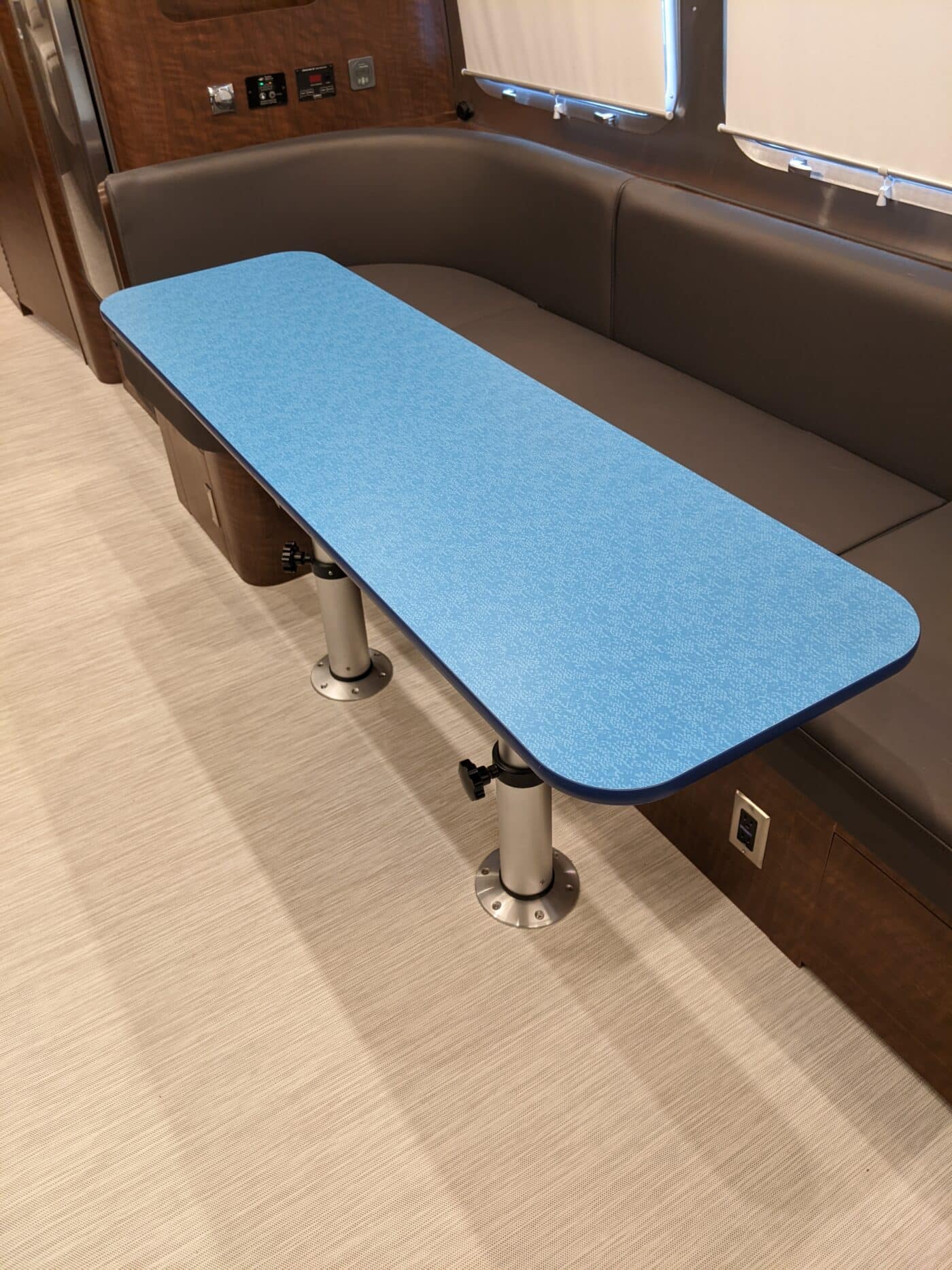 9. The dining/galley table has been upgraded. The original table pedestals have been replaced with robust, yacht quality adjustable pedestals, eliminating the wobbly table that is so characteristic of the OEM table.