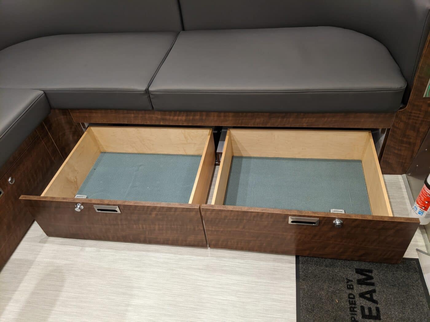 20. The factory Globetrotter trailer came equipped with only 2 drawers located in the kitchen base cabinet. We’ve added 16 additional drawers throughout the trailer; eliminating the “what were they thinking” bins that you were expected to use for storage. Because you’re camping in a trailer doesn’t mean it has to be inconvenient.