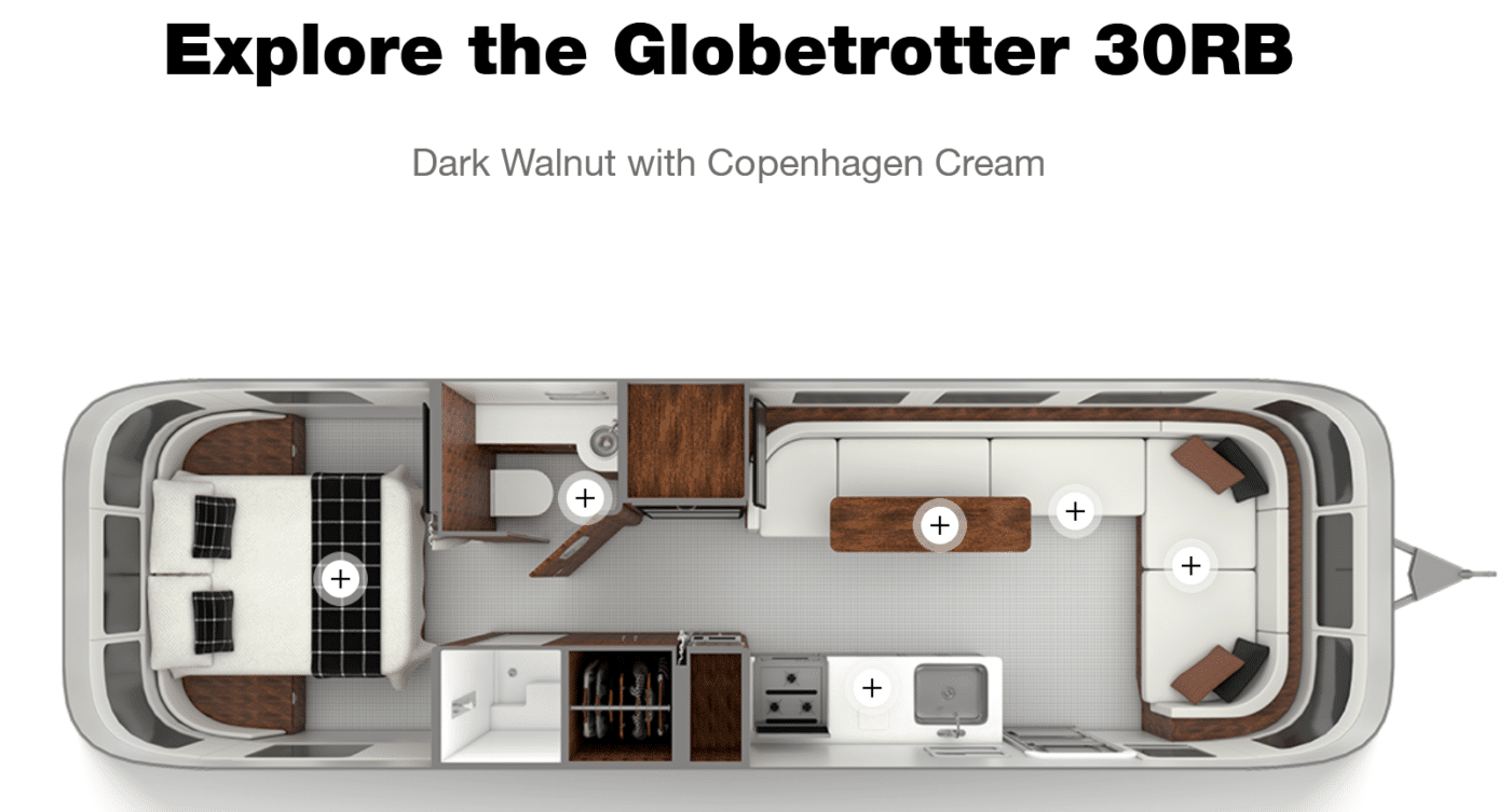 She is a 30′ Rear Queen Bed Globetrotter in the Copenhagen Cream decor package and is fully decked out to be your home away from home.