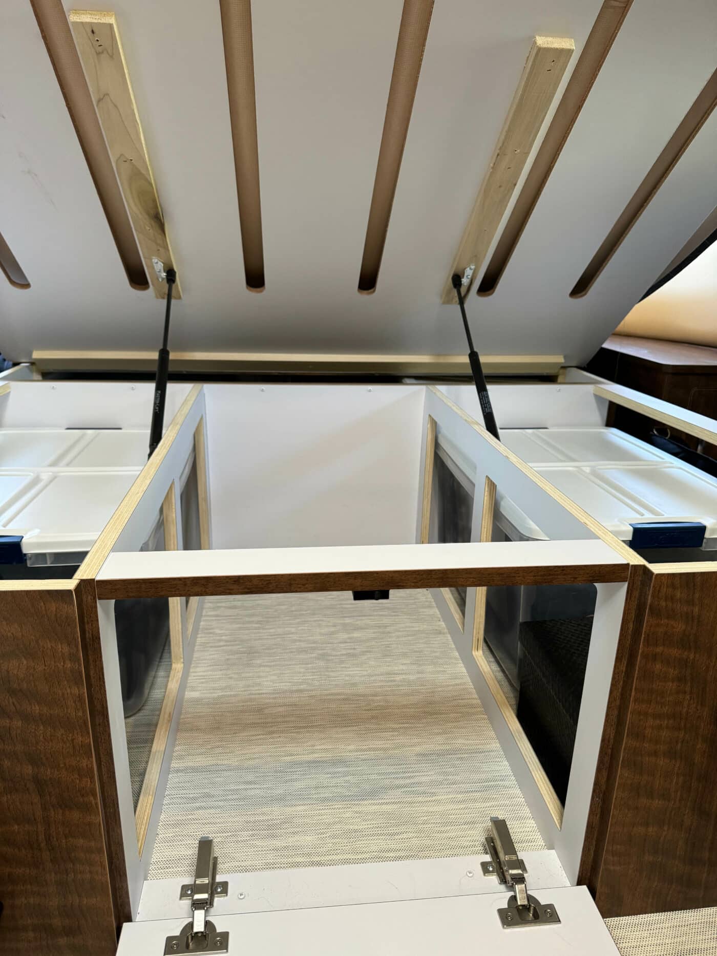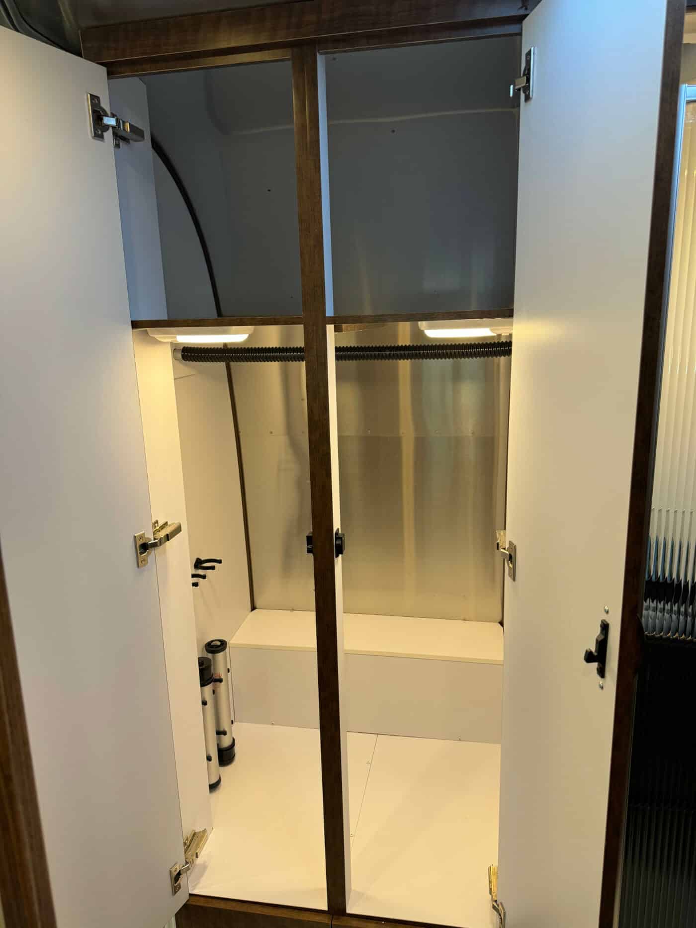 The table has two sets of legs, as well as caps for the floor mounts to make it as flush as can be. The closet has two storage configurations for the table legs mounted to the wall so that you can store them when they are not in use. If you use the shorter legs, you can lower the table to be made into another double bed to sleep six.