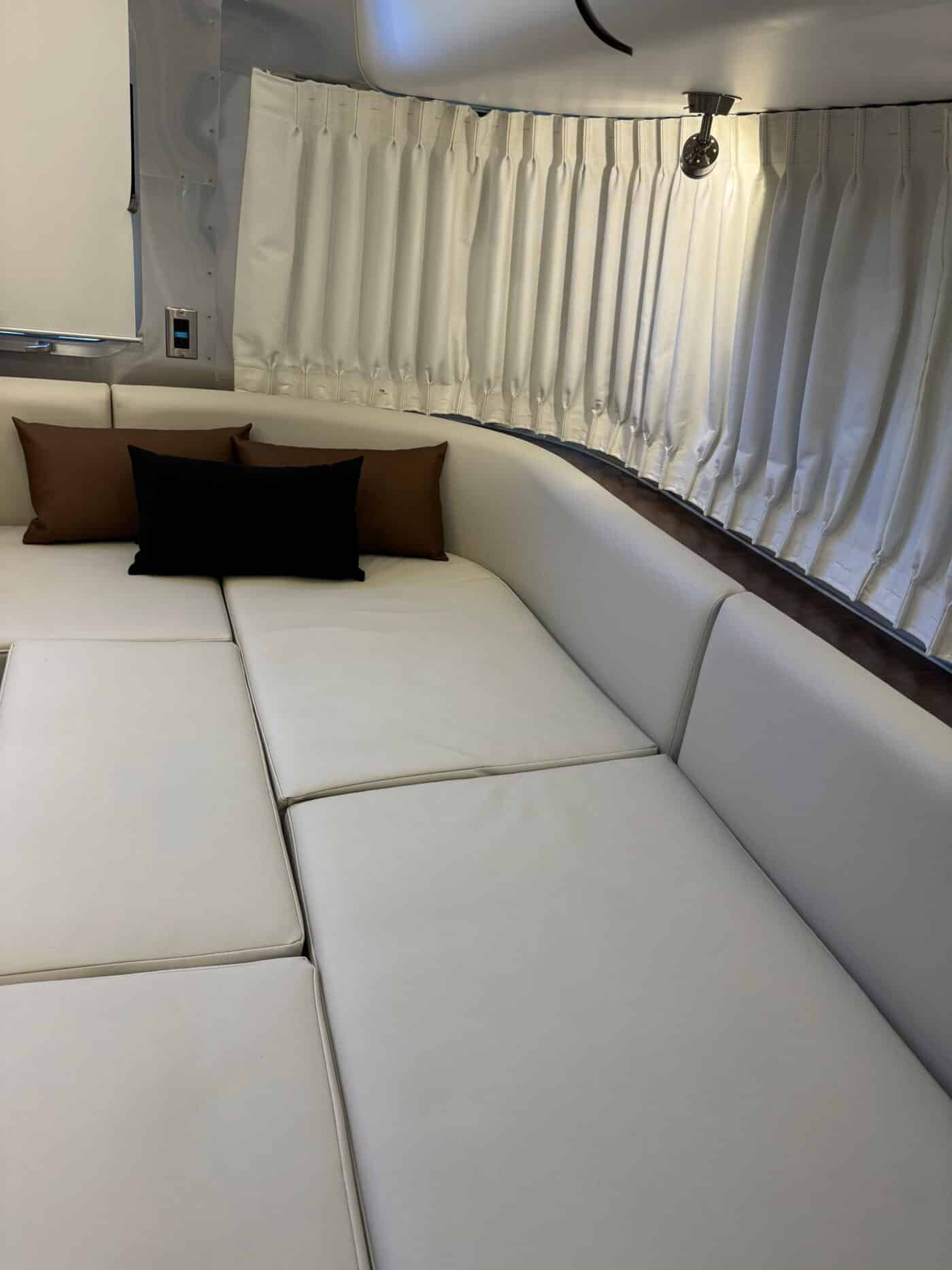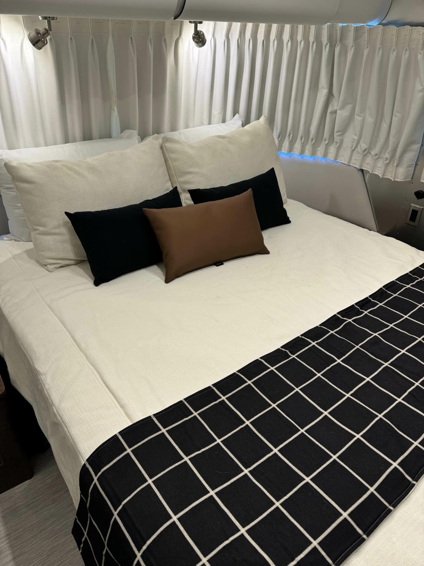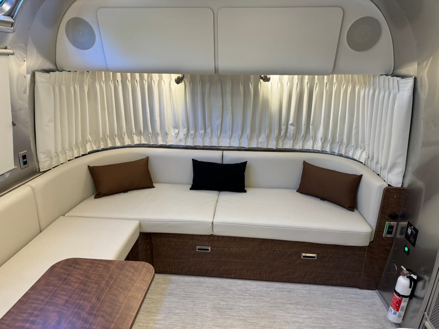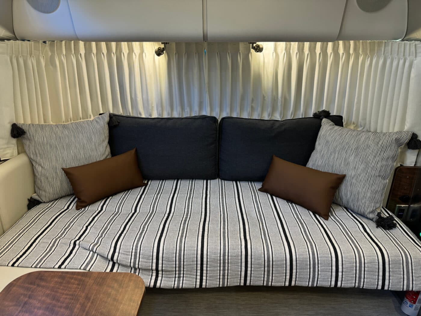Initially we were interested in the Airstream Pottery Barn for the comfy couch in the living room, so we compromised and brought in our own couch cushions and comforter to DIY a couch set up. This is pictured with the black and white comforter set up. We can include the couch back cushions and some of the throw pillows in this set up if you are interested.