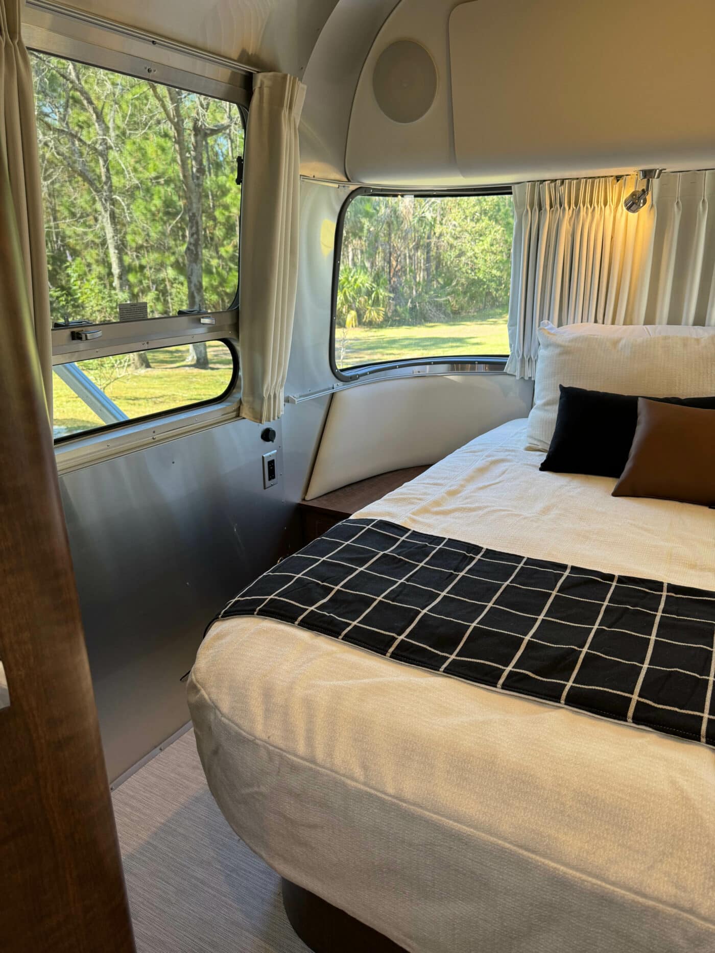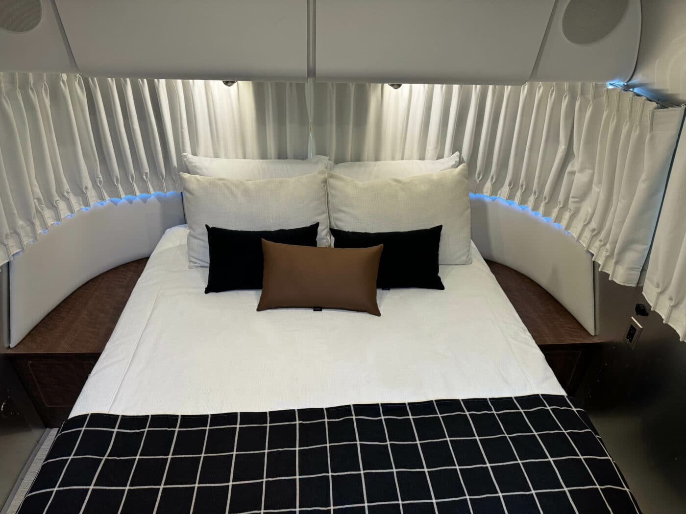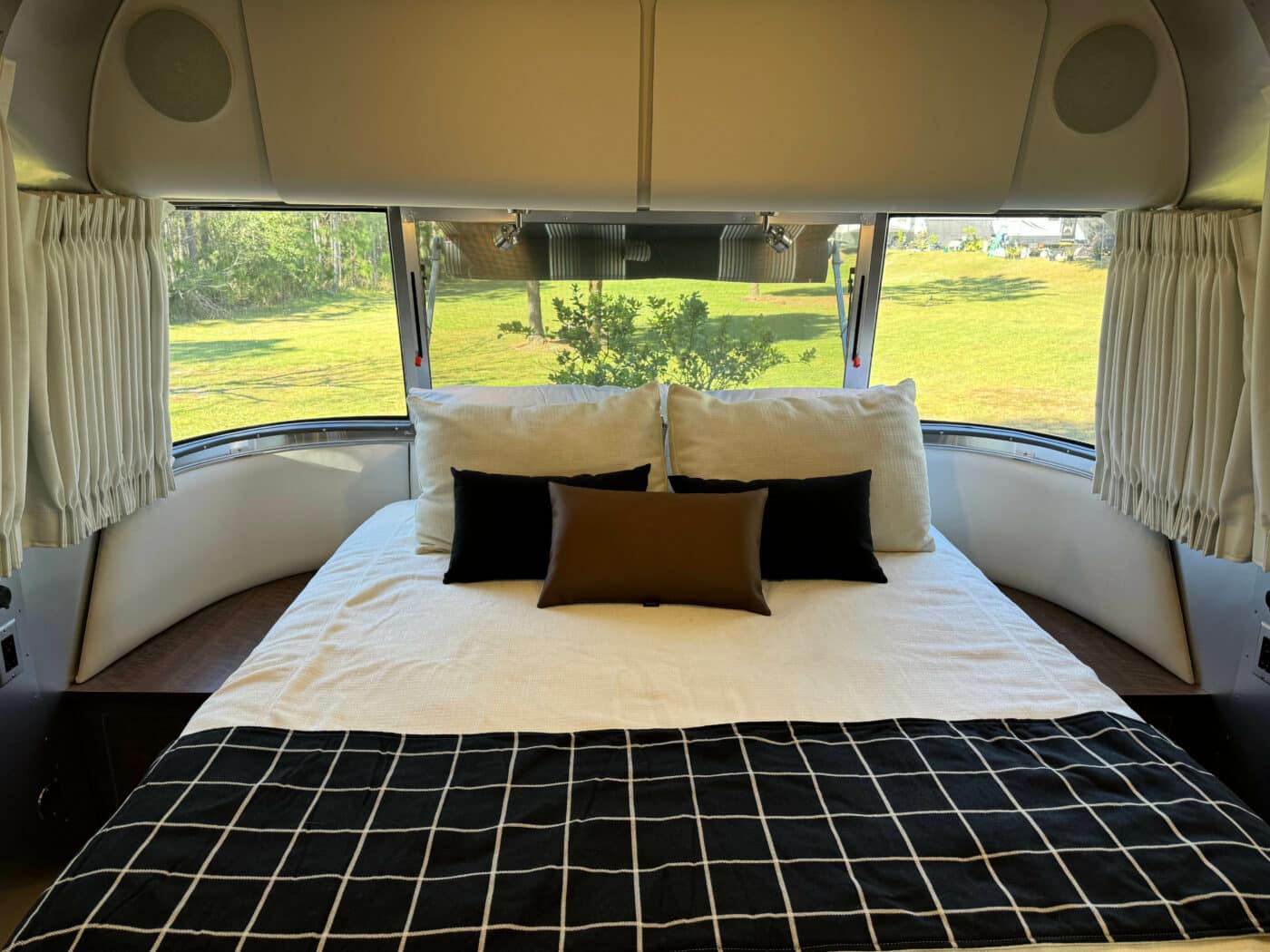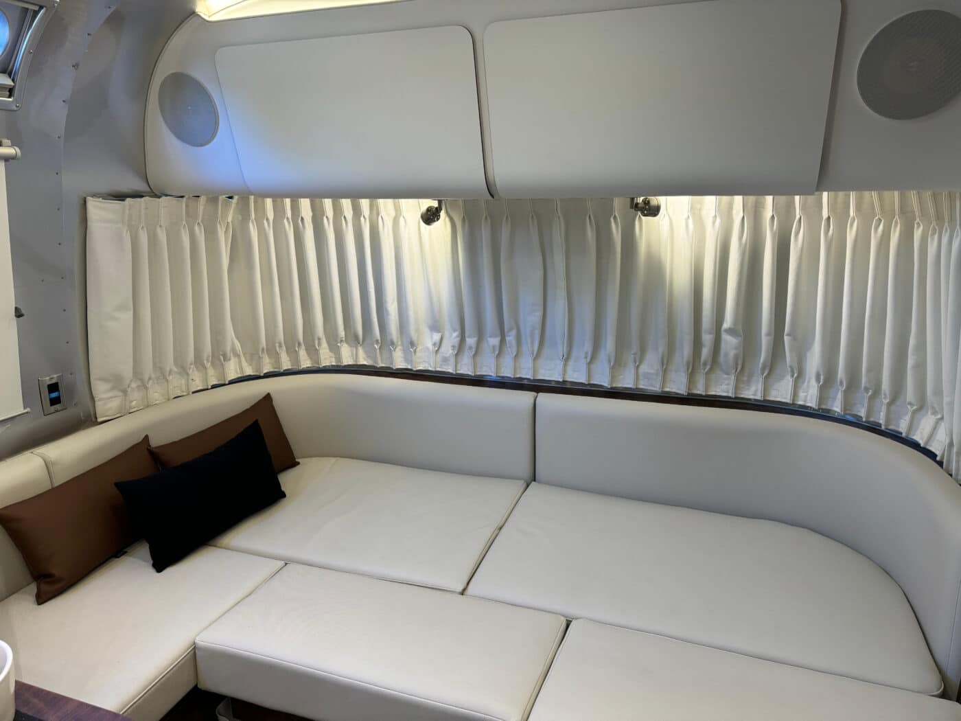 Initially we were interested in the Airstream Pottery Barn for the comfy couch in the living room, so we compromised and brought in our own couch cushions and comforter to DIY a couch set up. This is pictured with the black and white comforter set up. We can include the couch back cushions and some of the throw pillows in this set up if you are interested.