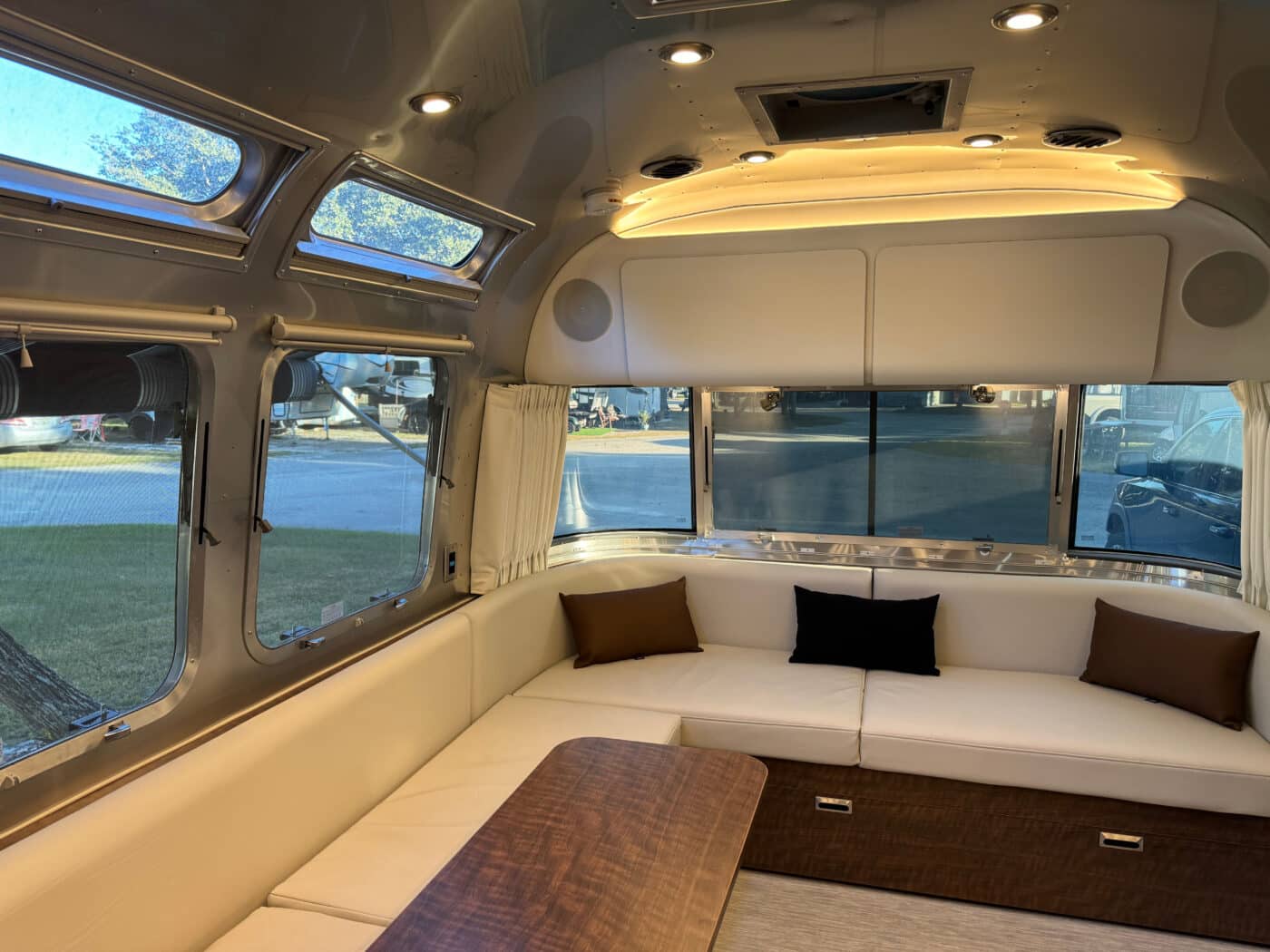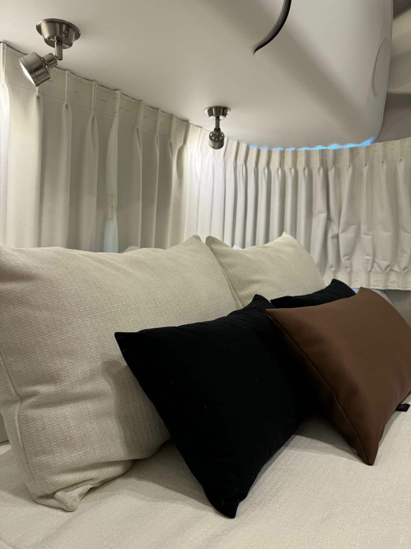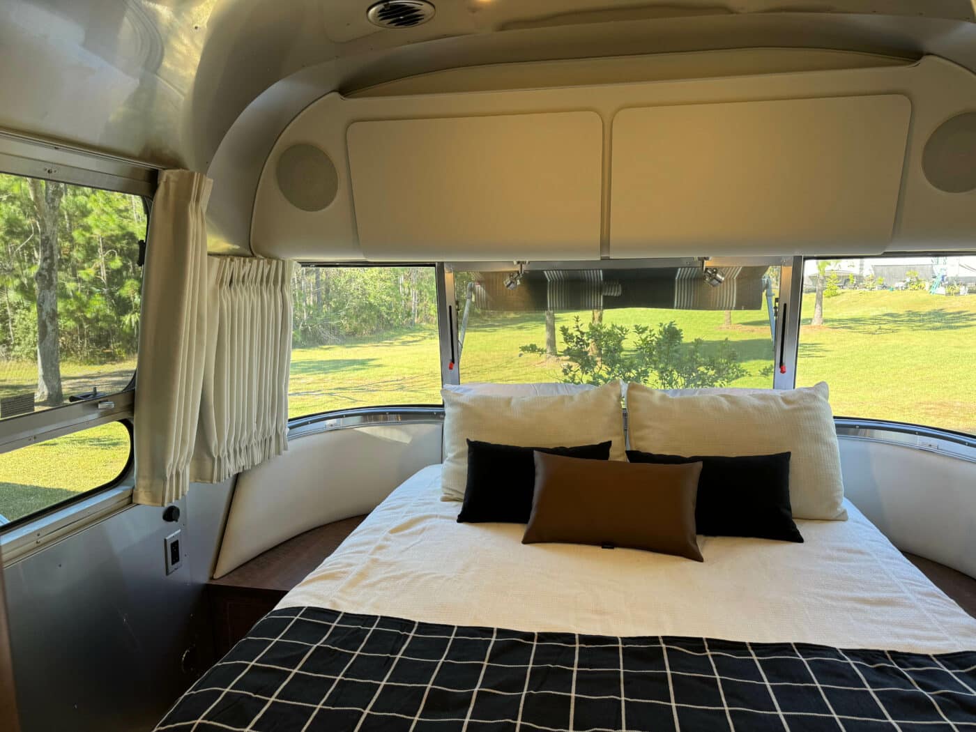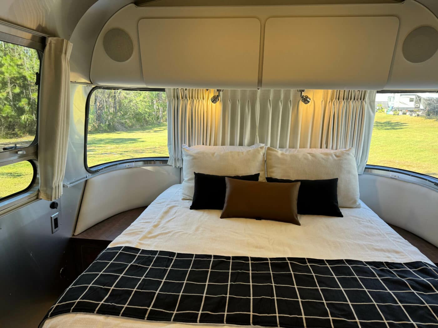 Initially we were interested in the Airstream Pottery Barn for the comfy couch in the living room, so we compromised and brought in our own couch cushions and comforter to DIY a couch set up. This is pictured with the black and white comforter set up. We can include the couch back cushions and some of the throw pillows in this set up if you are interested.