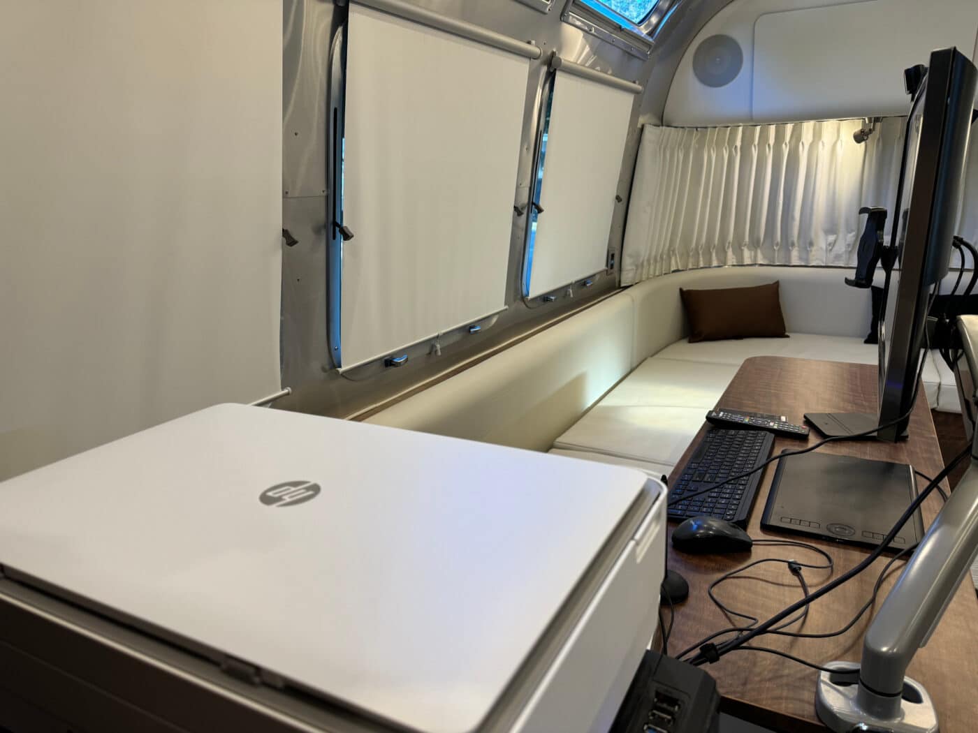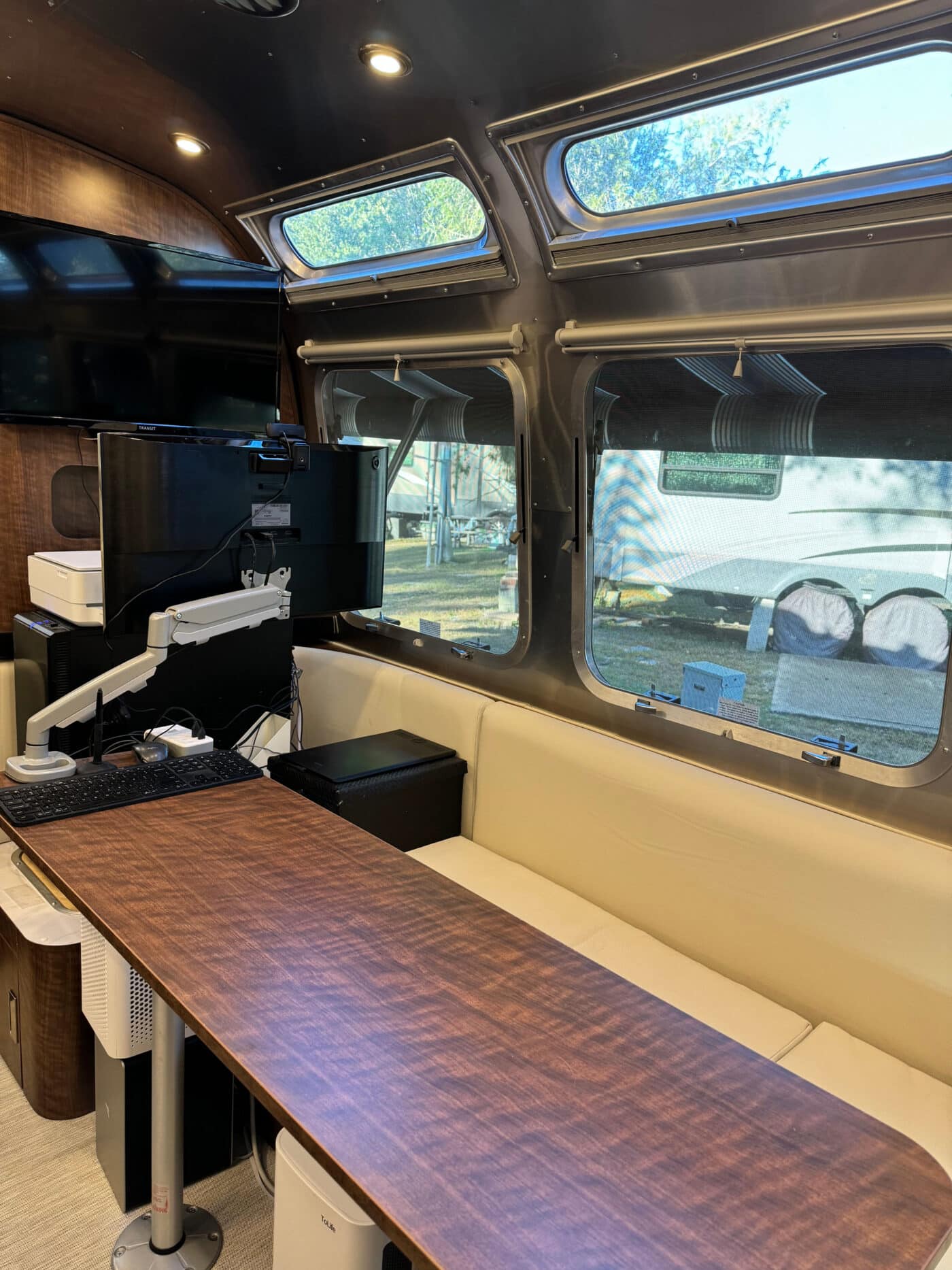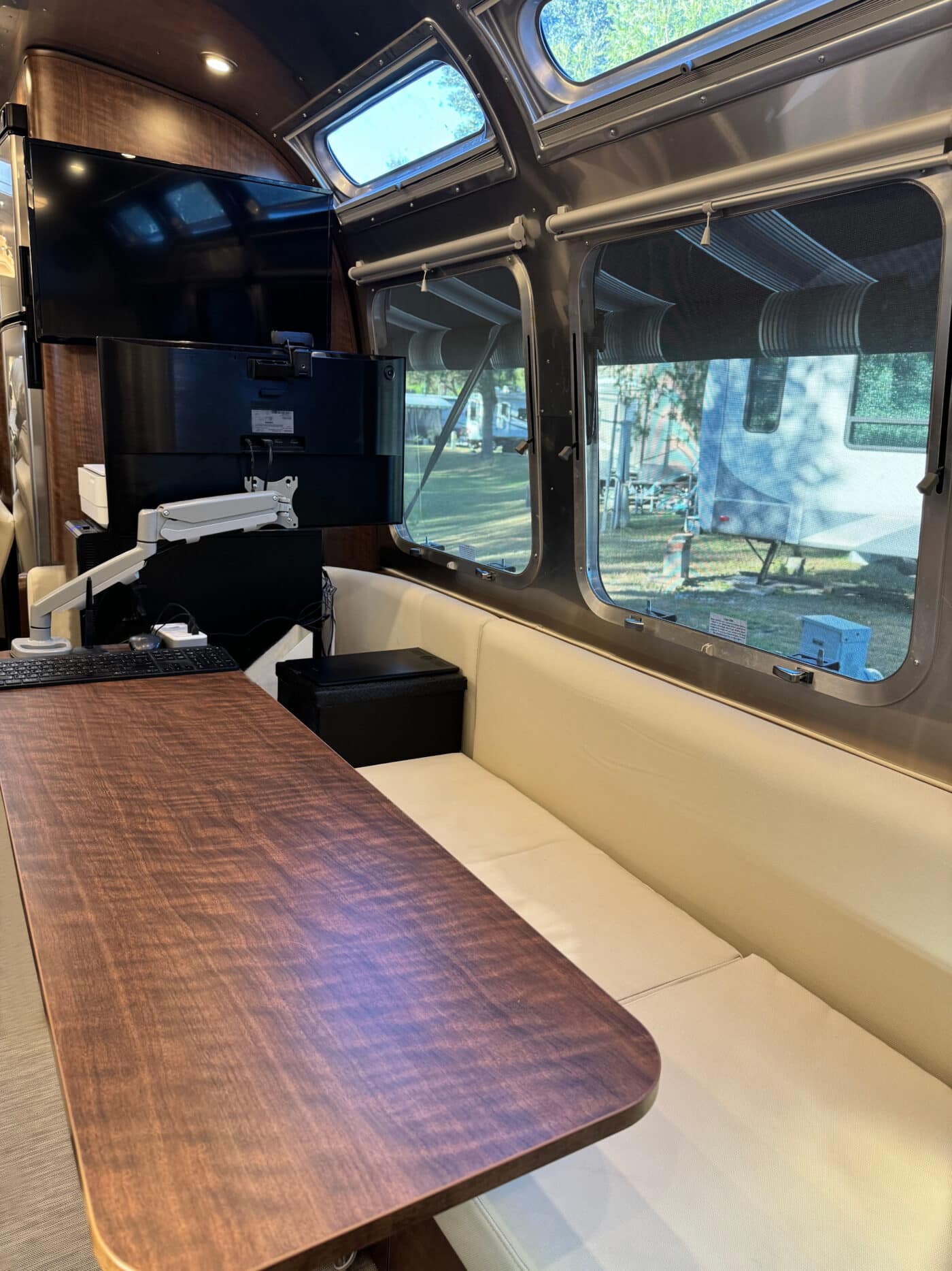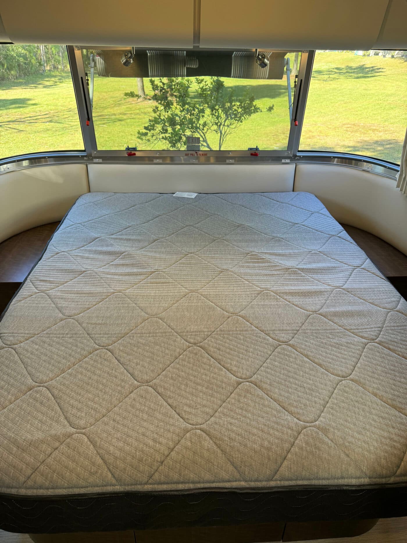 Initially we were interested in the Airstream Pottery Barn for the comfy couch in the living room, so we compromised and brought in our own couch cushions and comforter to DIY a couch set up. This is pictured with the black and white comforter set up. We can include the couch back cushions and some of the throw pillows in this set up if you are interested.