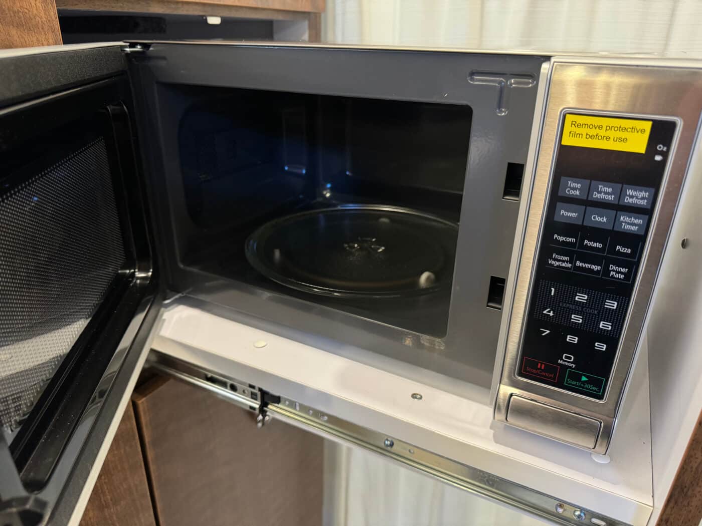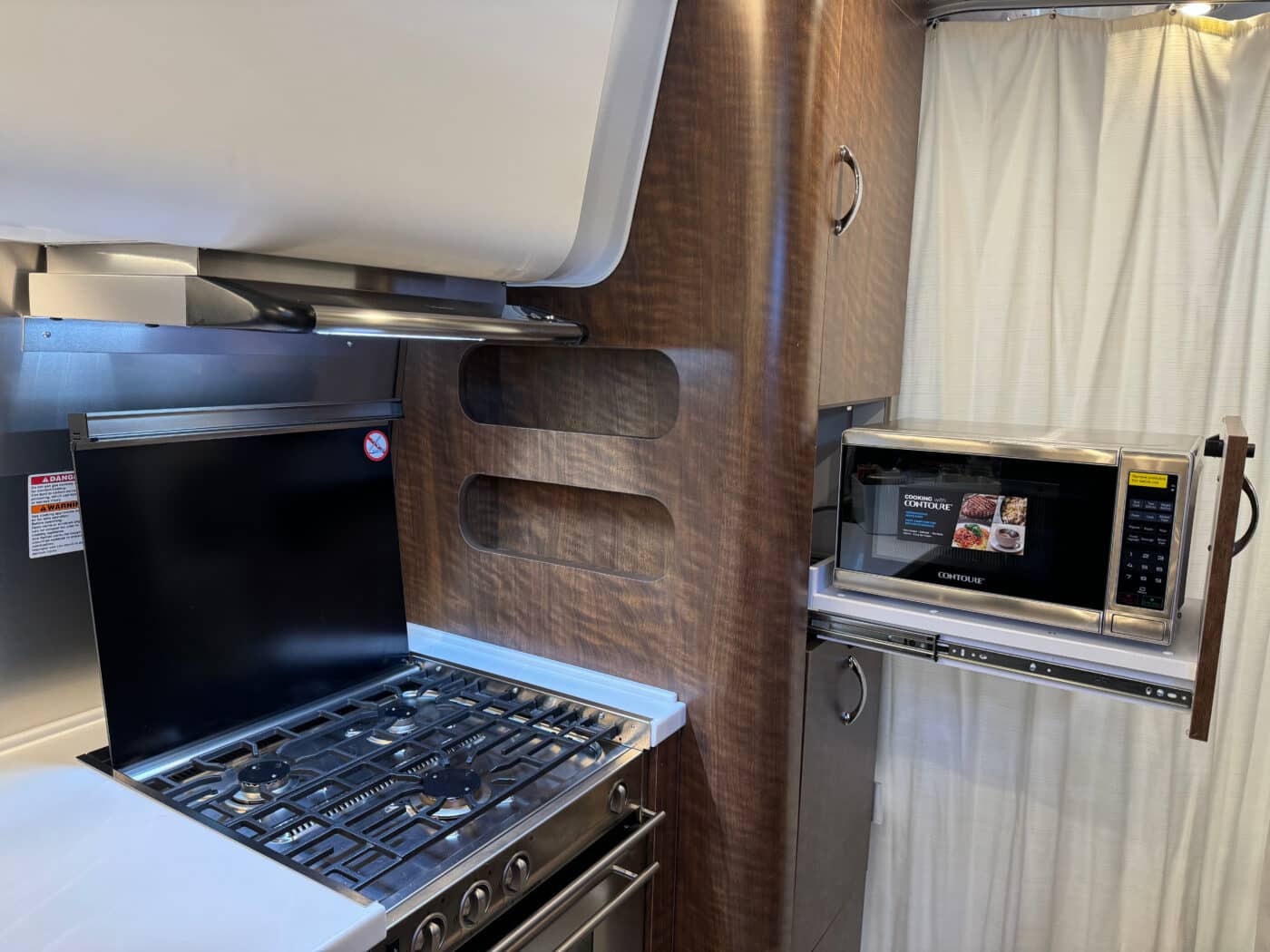 This model comes with the propane stove/oven and the microwave. We have never used the microwave and instead opted to use the microwave space for additional storage. See pics.