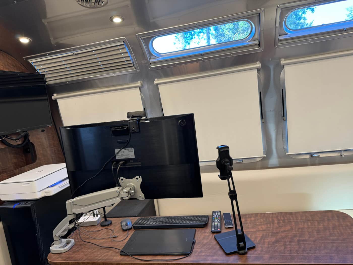 You will see how we had our home office set up with one monitor on a monitor arm that you can move if you needed to have full use of the table.