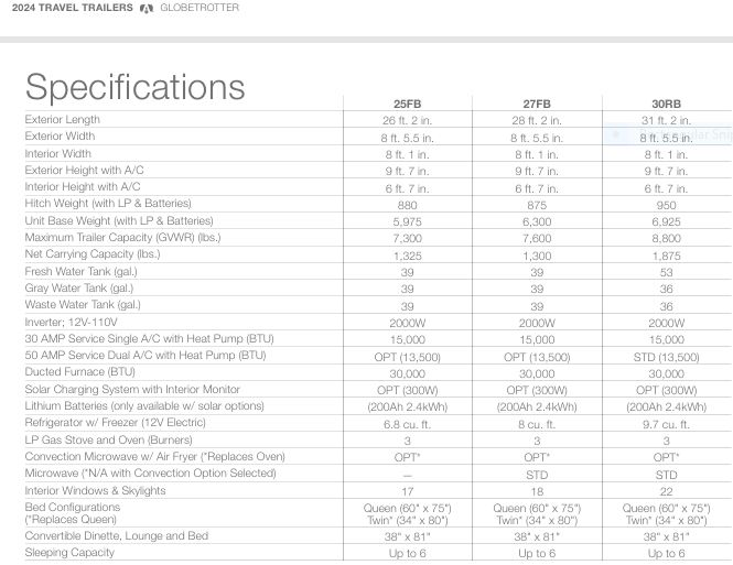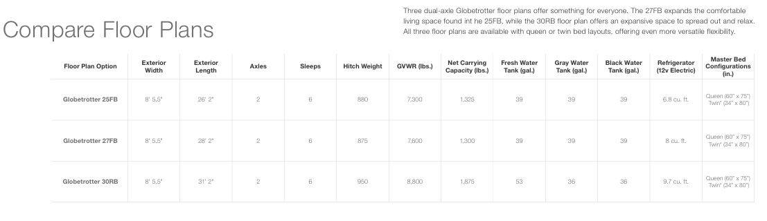 – The Globetrotter 27 FBT may be your perfect size and layout. Twin beds are 6 inches longer, provides a center aisle for a second lounge area with increased storage accessibility, and wide panoramic vista viewing in aft main cabin.
