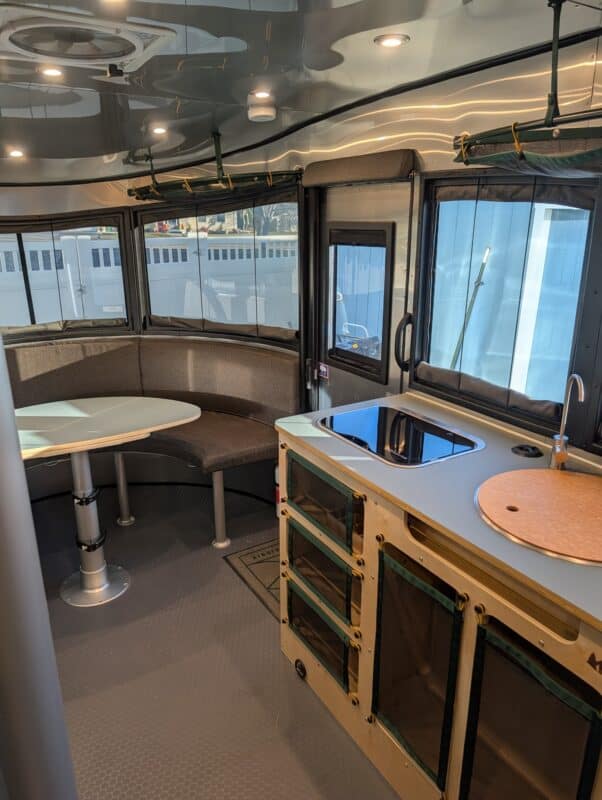 Spacious Interior: The 20-foot floor plan offers a large U-shaped dinette that converts to a massive bed, a front kitchen, and a generous wet bath.